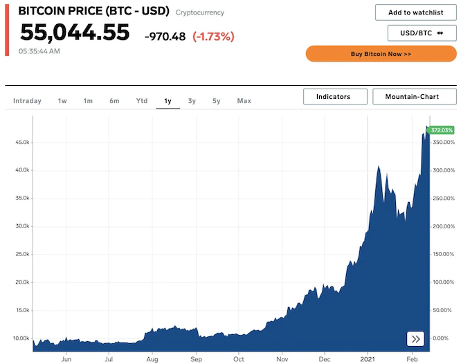 비트코인 가격은 2020년 4배로 치솟았으며 결국 2021년 2월에 $ 58,000의 사상 최고치를 기록했습니다.